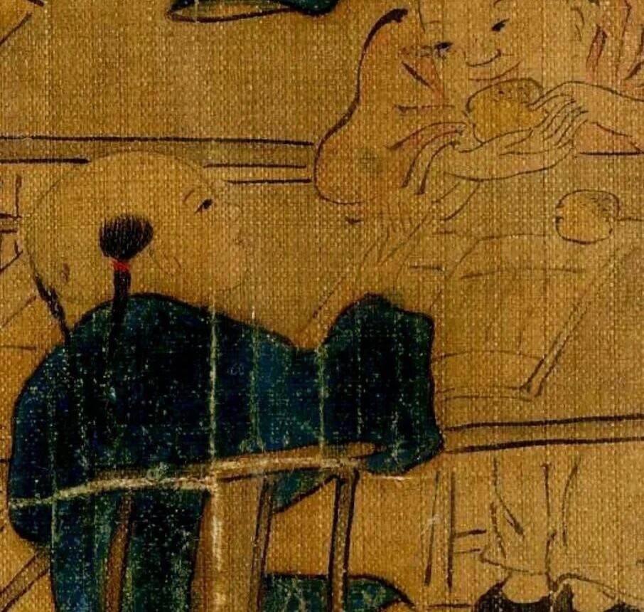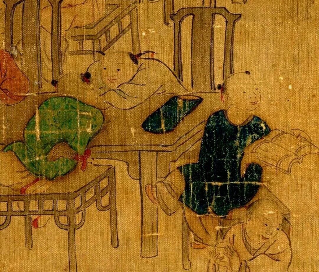 还有那屋前的院中,紫衣小孩蹲在地上给真诚画像,支配的小孩更夸张,顶着茶壶,画了胡子,披着草书长卷,拿着戒尺当笏板,把真诚当成天子来拜,这设想力,几乎了!