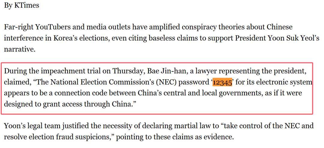 根据该报的先容,尹锡悦的讼师声称,尹锡悦昨年之是以领略劝诫严并让士兵进驻国会以及韩国的国度选举委员会,其中一个原因是尹锡悦发现韩国国度选举委员会的系统密码是“12345”。该讼师还进一步声称,这个“12345”在中国事有着“疏淡含义”的代码,中国各地政府王人在使用,是以尹锡悦有事理怀疑,韩国国度选举委员会是专诚把密码缔造成“12345”的,好与中国暗里磋议。